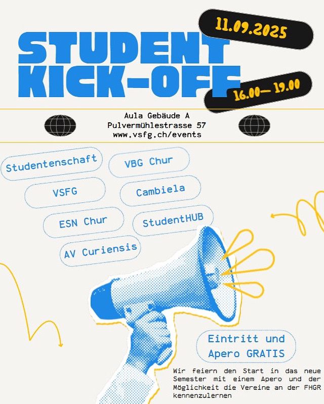 Am 11. September 2025 findet von 16:00 bis 19:00 Uhr der Kick-off-Event statt. Eingeladen sind alle neuen Studierenden sowie alle bereits eingeschriebenen Studierenden, um sich besser kennenzulernen, sich auszutauschen und neue Kontakte zu knüpfen. Der Anlass bietet zudem die Gelegenheit, die verschiedenen Studierendenverbindungen der Fachhochschule Graubünden näher kennenzulernen und erste Einblicke in das studentische Leben zu erhalten. Organisiert wird der Event gemeinsam mit den anderen Studierendenvereinen der FH Graubünden.
